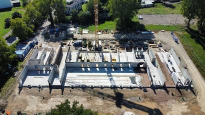 Nachdem im Juni die Streifenfundamente vorbereitet und gegossen wurden, ging es im Juli an das gießen der Bodenplatte. Nach Vorbereitungen von notwendigen Versorgungsleitungen wurde der Boden betoniert. In Kalenderwoche 30 wurden nun die ersten Wände gestellt. Fertigteile aus Beton wurden dazu an entsprechender Stelle aufgerichtet. Die Zugänge zu den Umkleiden, Werkstätten und Lager sind schon erkennbar.