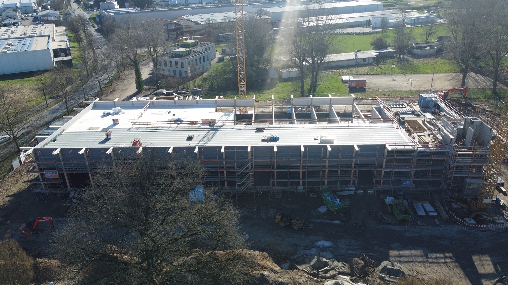 Im Februar wurde weiter das Dach geschlossen. Die Fahrzeughallen und der DRK Bereich sind nun bereits vollständig geschlossen. In der Fahrzeughalle der Feuerwehr wurde der Boden gegossen. Im Außenbereich ist das Versickerungsbecken für das Oberflächenwasser angelegt. Weiter wurde am Schlauch- und Übungsturm kräftig gearbeitet. Stück für Stück wird das Treppenhaus mit den Übungsbalkonen nach oben gezogen. Wenn man in die Stadt reinfährt sieht man schon die Wand über das Dach hinaus zu ragen.