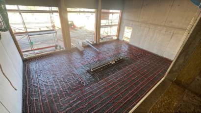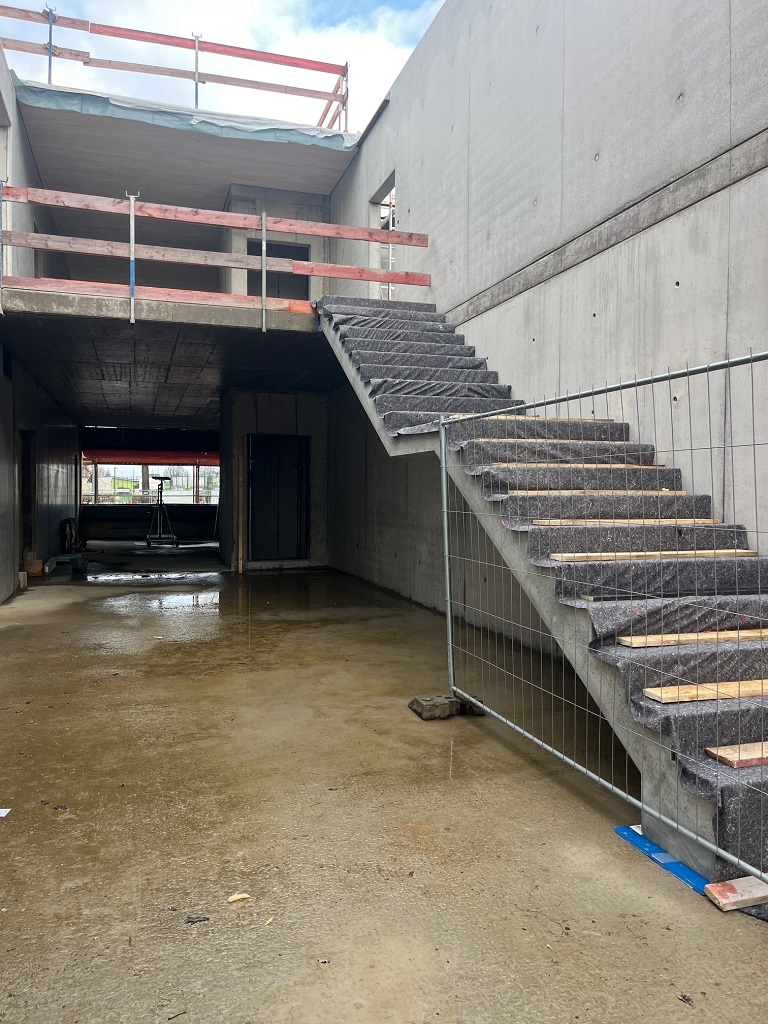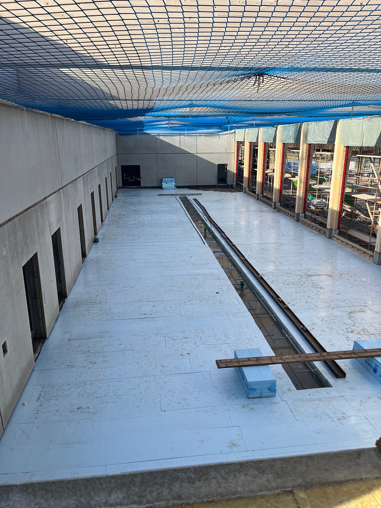 Im Innenbereich wurden die beiden Treppen im Haupteingang und neben dem Lagerbereich montiert. Weiterhin wurden die ersten Deckenelemente über der Fahrzeughalle montiert und das Dach wird langsam geschlossen. Die Isolierung für den Boden in der Fahrzeughalle ist bereits verlegt und nach Schließen des Daches kann dieser Boden gegossen werden. Im Außenbereich wurde auf der Westseite begonnen das Versickerungsbecken für das Oberflächenwasser anzulegen. Es geht mit großen Schritten vorwärts.