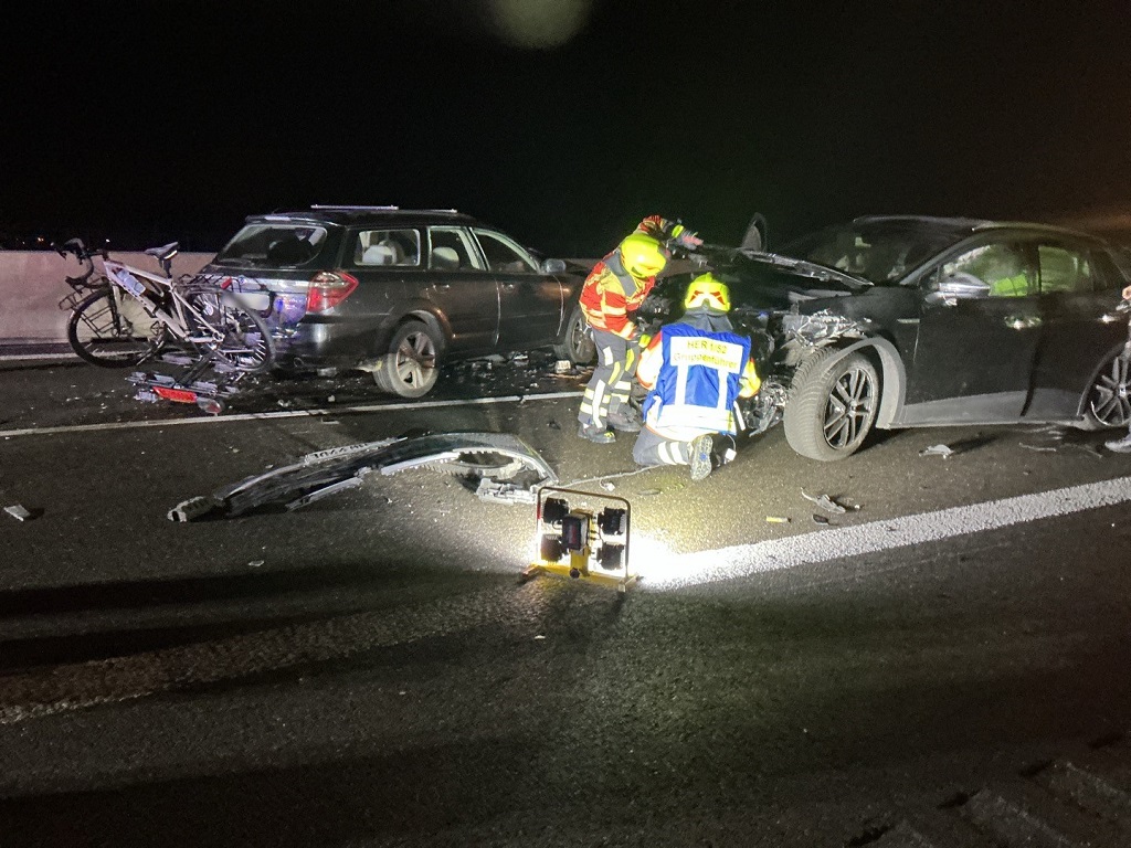 Am Samstag, den 22. November wurde die FFW Abt. Herbolzheim um 22.24 Uhr zur Absicherung eines Verkehrsunfalles auf die BAB 5 Richtung Süden alarmiert. Auf Höhe von Kenzingen kollidierten insgesamt vier PKW. An der Einsatzstelle angekommen, blockierten die Unfallfahrzeuge die komplette Fahrbahn und es gab ein Trümmerfeld von ca. 150 Meter. Zunächst wurde die Autobahn komplett gesperrt und die Unfallstelle abgesichert. Die Verletzten wurden vom Rettungsdienst betreut und betroffen Personen gesichtet. Für die Unfallaufnahme der Polizei wurde die Fahrbahn ausgeleuchtet. Auslaufende Betriebsstoffe wurden durch die Feuerwehr gebunden und der Brandschutz sichergestellt. Anschließend wurde der Standstreifen durch die Feuerwehr gereinigt und der Verkehr an der Unfallstelle vorbei geleitet. Nach der Reinigung der Fahrbahn und Eintreffen der Autobahnmeisterei konnte die Unfallstelle an die Polizei übergeben werden.
